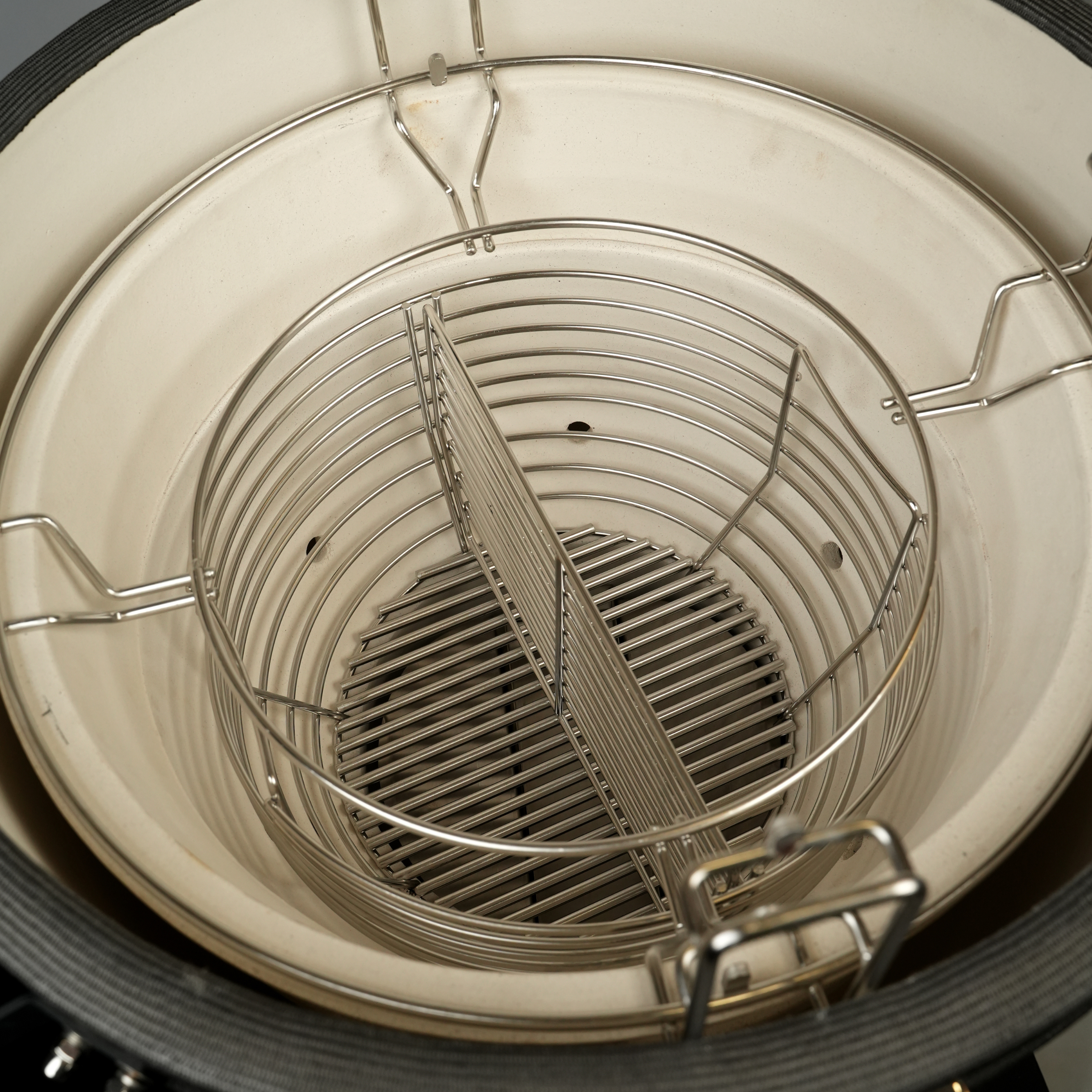 - Viene con: 4 sondas de temperatura, clip de sonda de parrilla, pinzas para cocinar, pinzar para el carbón, 2 parrillas de hierro fundido, 2 parrillas de acero inoxidable y piedra para pizza de 33 cm.